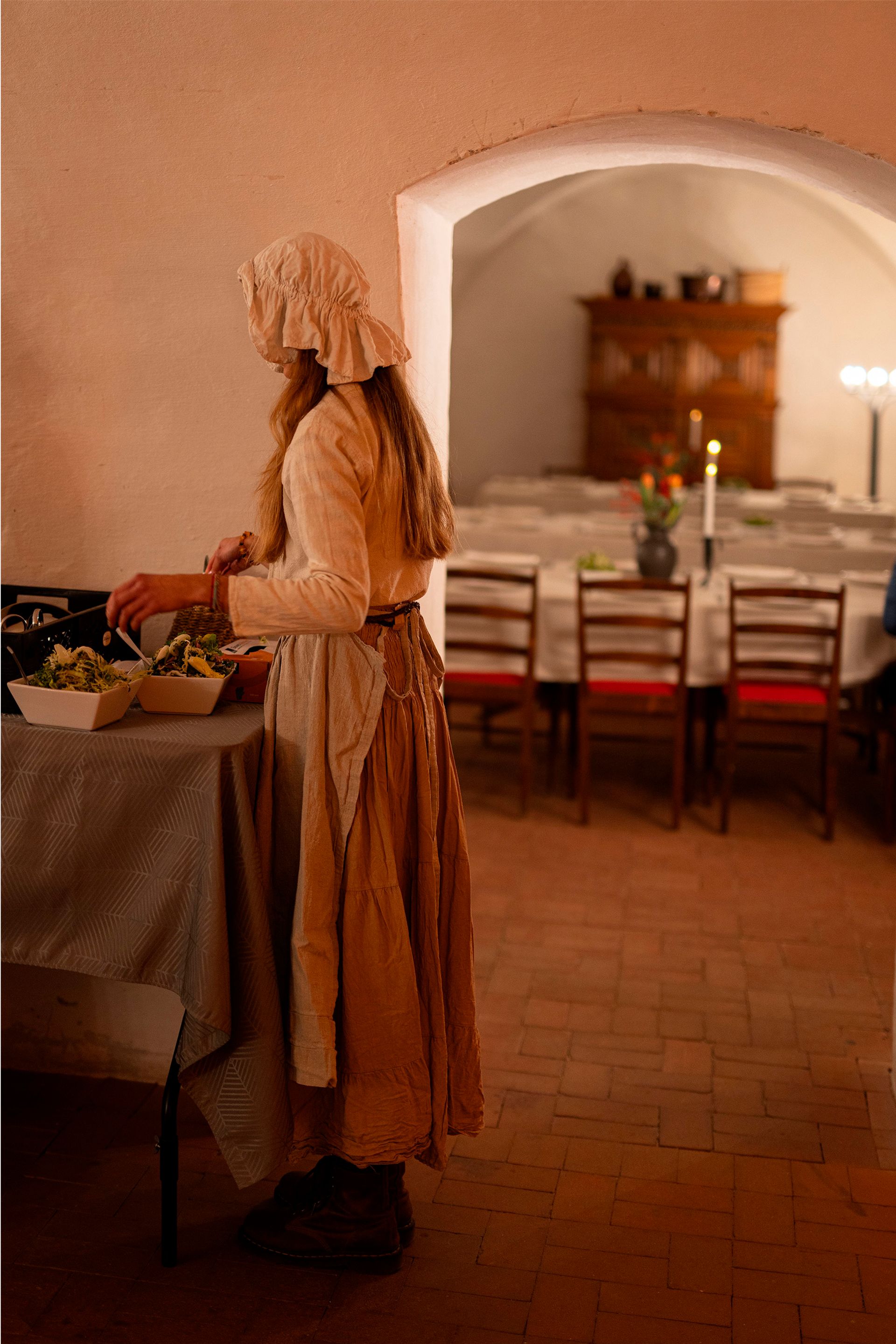 Maven rumler efter have udforsket slottet. Så nu skal du sætte dig til bords i den gamle vinkælder på slottet. Her er opstillet fællesborde, hvor du kan nyde lækre middage og godt selskab i de rum, hvor hundredvis af mennesker gennem tiden har haft deres daglige gang.
